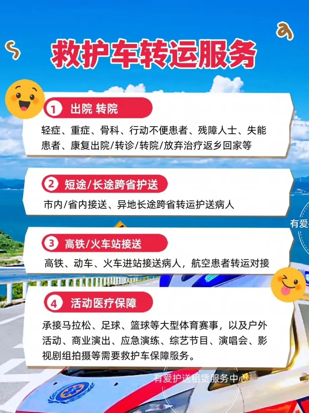 我们是救护车出租转运公司,120救护车接送病人预约护送。24小时为术后康复、危重患者及跨区域就医人群提供专业医疗转运服务,提供120救护车出租‖救护车转运‖私人120救护车(非急救)‖跨省长途转运‖危重病人转运‖市内转运‖术后康复病人转运‖高铁病人转运‖患者返乡‖大型活动赛事保障‖配备ICU设备:呼吸机▪心电监护仪▪吸痰器•微量泵•氧气▪急救药箱▪专业医护团队