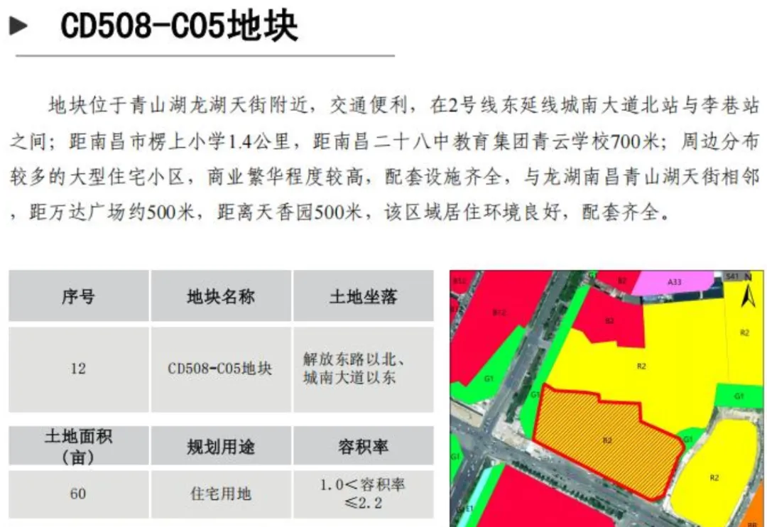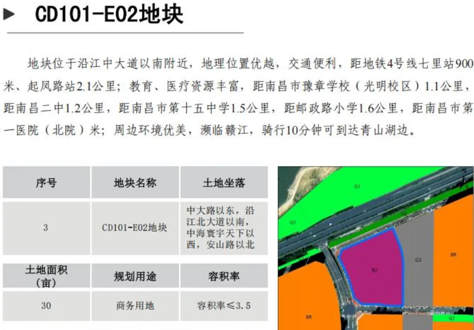 地块名称CD101-E02东湖区沿江北大道以南、中大路以东、中海寰宇天下以西、安山路以北(青山湖西岸10号地块);面积30.00亩;土地用途商住用地。容积率≤3.5。