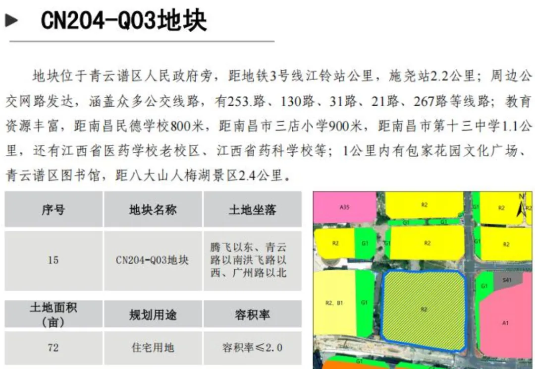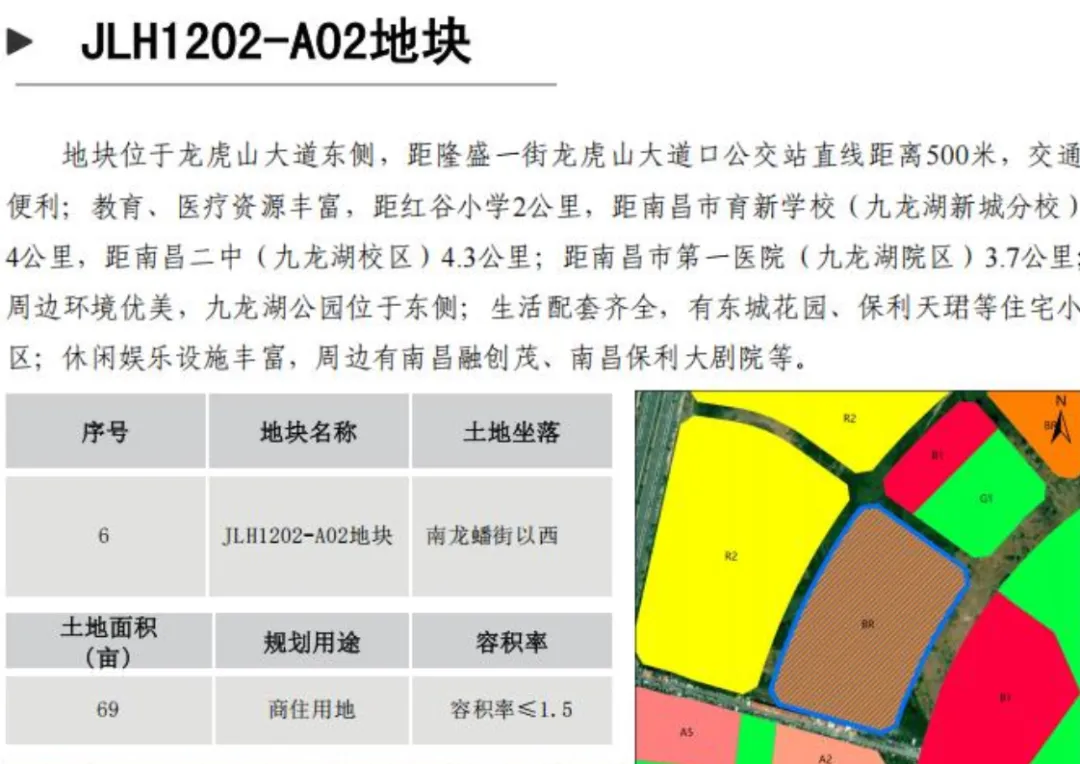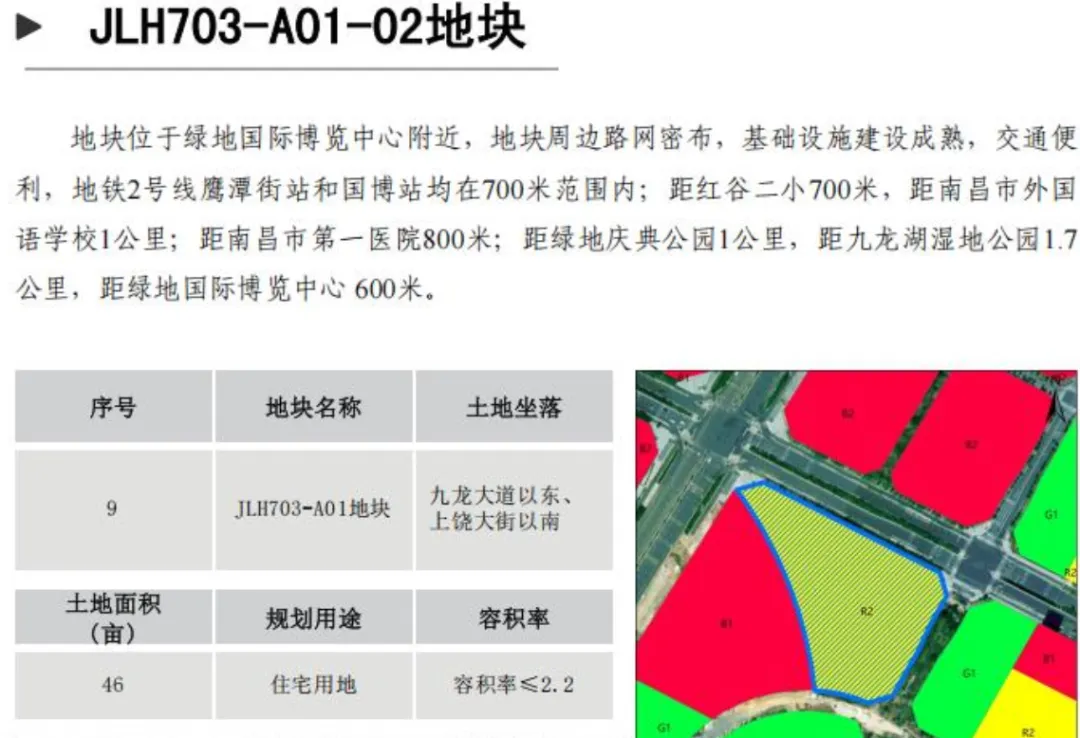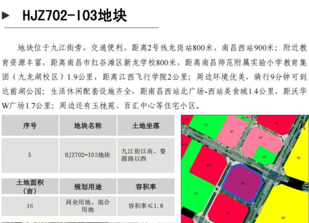 HJZ702-103地块周边近红谷滩区公共卫生服务中心、玉栊苑怡园、玉栊苑和园、新龙学校等项目。交通便利,距离2号线龙岗站800米,南昌西站900米;土地面积16亩;规划用途商业用地、混合用地;容积率≤1.8。