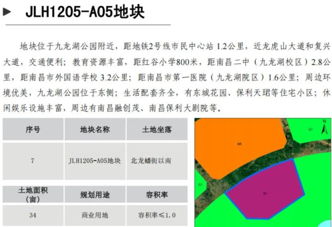 JLH1205-A05地块位于地块位于九龙湖公园附近,距地铁2号线市民中心站1.2公里,近龙虎山大道和复兴大道;周边环境优美,九龙湖公园位于东侧;有东城花园、保利天珺等住宅小区;休闲娱乐设施丰富,周边有南昌融创茂、南昌保利大剧院等。土地面积34亩;规划用途商业用地;容积率≤1.0。