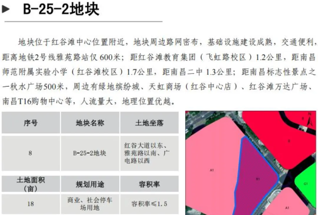 B-25-2地块位于红谷大厦以东、会展路以北;面积为18亩;土地用途商业用地。容积率≤1.5,建筑密度≤50%,绿地率≥20%。