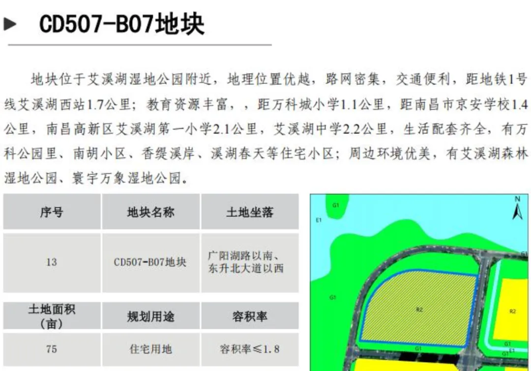 CD507-B07地块位于广阳湖路以南、东升北大道以西;面积为75亩;土地用途住宅用地。距万科城小学1.1公里,距南昌市京安学校1.4公里,南昌高新区艾溪湖第一小学2.1公里,艾溪湖中学2.2公里,生活配套齐全,有万科公园里、南胡小区、香缇溪岸、溪湖春天等住宅小区;周边环境优美,旁边便是寰宇万象湿地公园。容积率≤1.8。