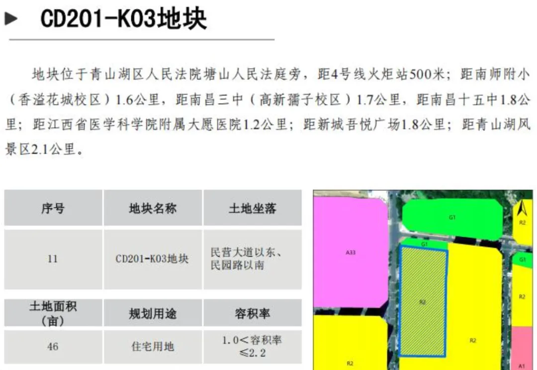 CD201-K03地块位于青山湖区民营大道以东、民园路以南;面积为46亩;土地用途住宅用地。容积率≤2.2,建筑密度≤22%,绿地率≥35%。