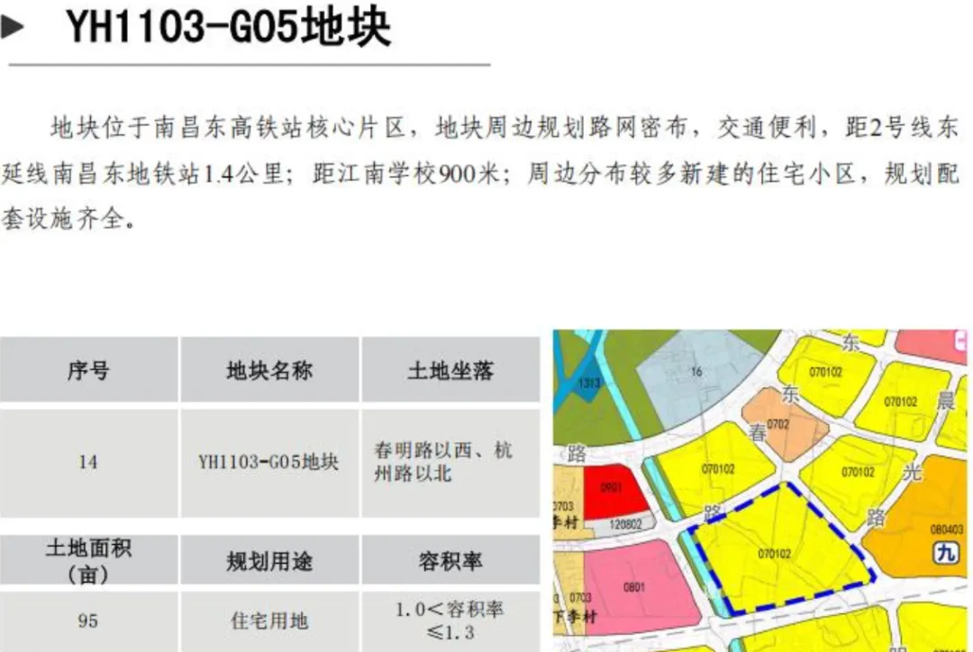 YH1103-G05地块位于位于南昌东高铁站核心片区,地块周边规划路网密布,交通便利,距2号线东延线南昌东地铁站1.4公里;距江南学校900米;周边分布较多新建的住宅小区,规划配套设施齐全。土地面积95亩,规划用途住宅用地。容积率≤1.3。