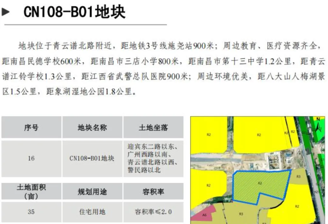 CN108-B01地块位于迎宾东二路以东、广州西路以南、青云谱北路以西、警民路以北;面积为35亩;土地用途住宅用地。容积率≤2.0,建筑密度≤30%,绿地率≥30%。