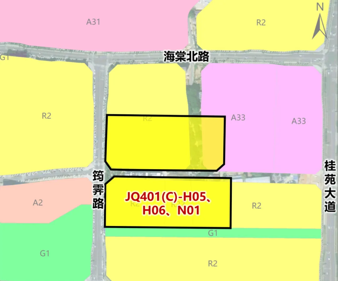 JQ401(C)-H05,JQ401(C)-H06,JQ401(C)-N01地块位于金晓咏荷以北;面积为52亩;土地用途住宅用地。容积率≤1.8(暂定)。
