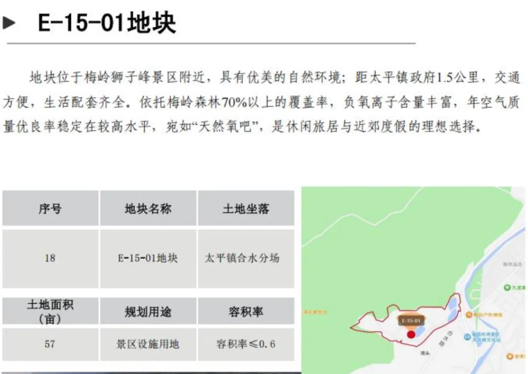 景区控规E-15-01地块位于太平镇合水分场;面积为57亩;土地用途景区设施用地。容积率≤0.6,建筑密度≤20%,绿地率≥35%。
