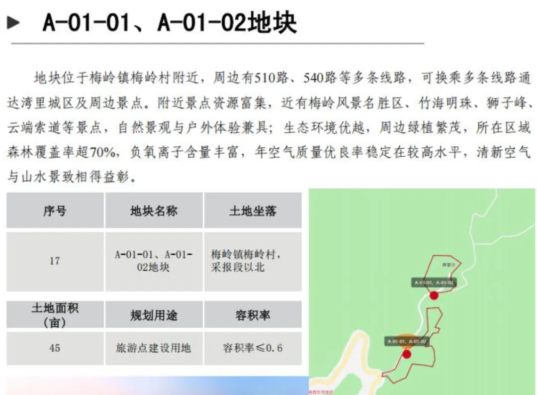 A-01-01、A-01-02地块位于梅岭镇梅岭村附近,周边有510路、540路等多条线路,可换乘多条线路通达湾里城区及周边景点。附近景点资源富集,近有梅岭风景名胜区、竹海明珠、狮子峰、云端索道等景点,自然景观与户外体验兼具;生态环境优越,周边绿植繁茂,所在区域森林覆盖率超70%,负氧离子含量丰富,年空气质量优良率稳定在较高水平,清新空气与山水景致相得益彰。