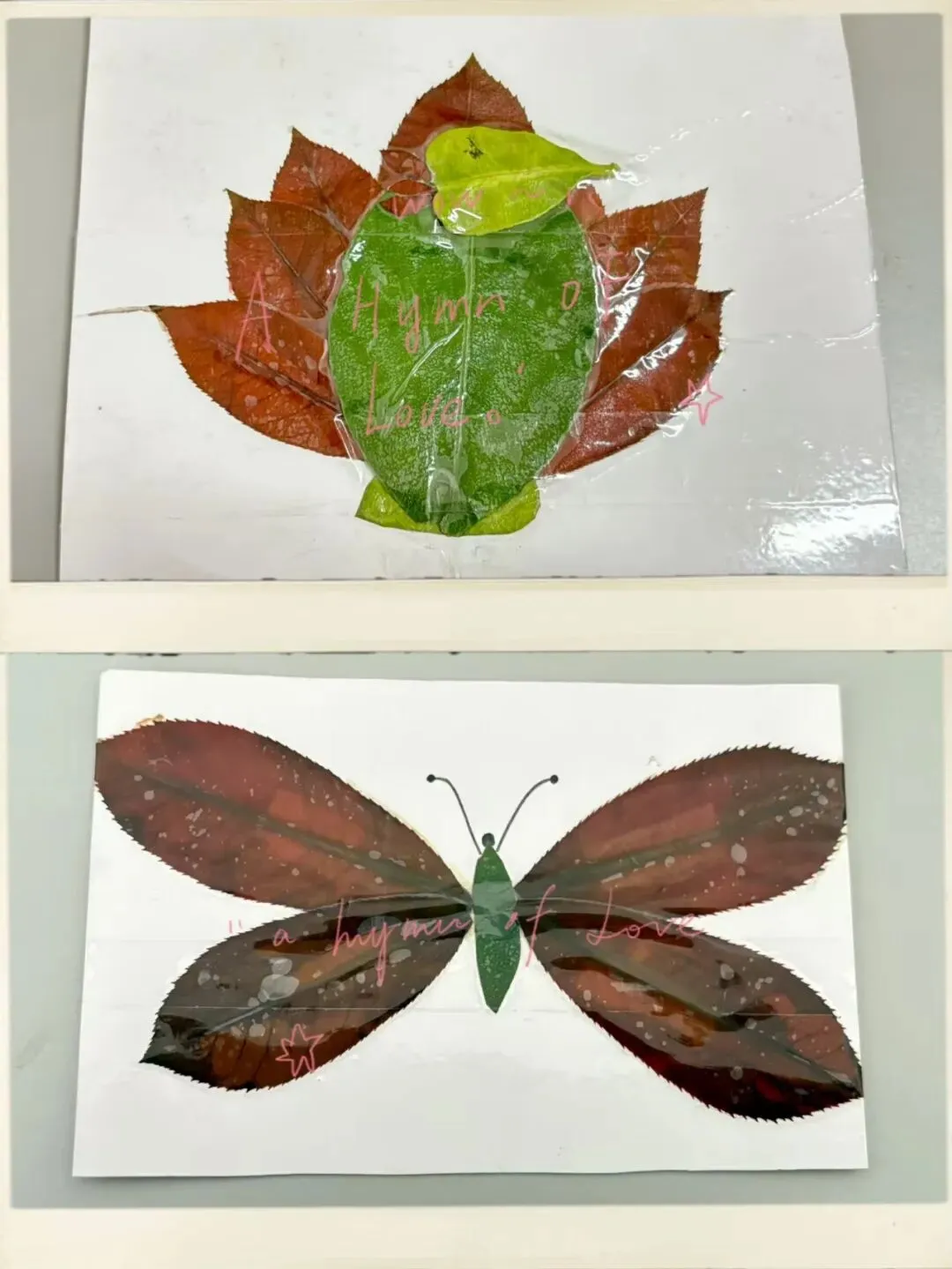 叶片在同学们的巧思下,或拼成蝴蝶,或化作孔雀,或以最自然的姿态静静舒展。叶脉清晰如缕,仿佛仍在诉说着光合作用的故事。