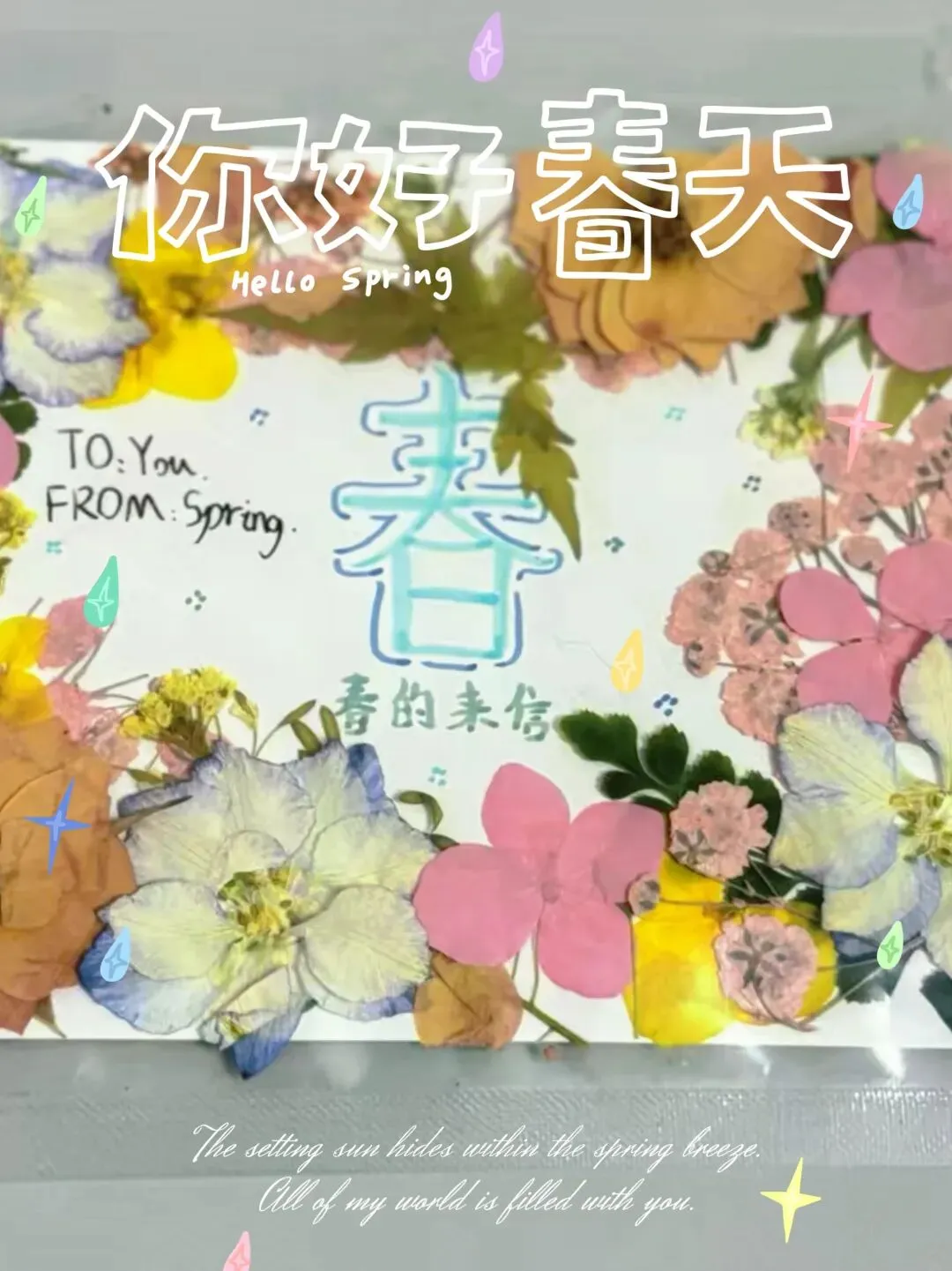 有人用花瓣给春天寄了一张明信片;有人将独一无二的花束送给敬爱的老师;有人把写满心语的书签系上枝头,向春天轻声诉说;还有人在纸上描绘出心中最美的春景。