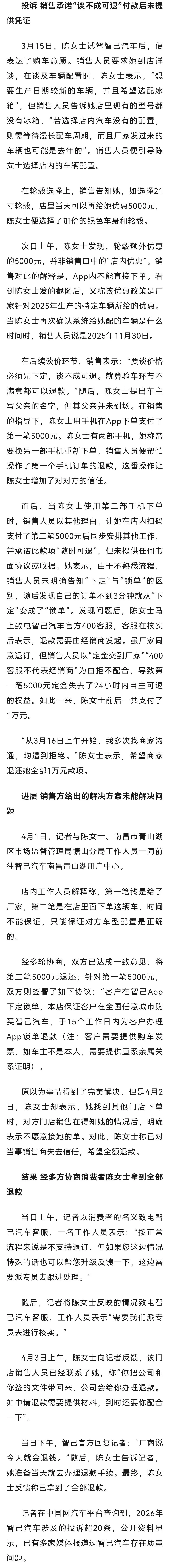 买车本是喜事,不料烦恼不断。近日,市民陈女士(化姓)反映,她在智己汽车南昌青山湖用户中心准备购车时,疑似遇到强制锁单、模糊定金规则、价格误导、随意变更承诺等问题,且前后交纳的1万元在申请退款时遭拒。经本报全媒体记者两度介入,陈女士最终拿到全额退款。