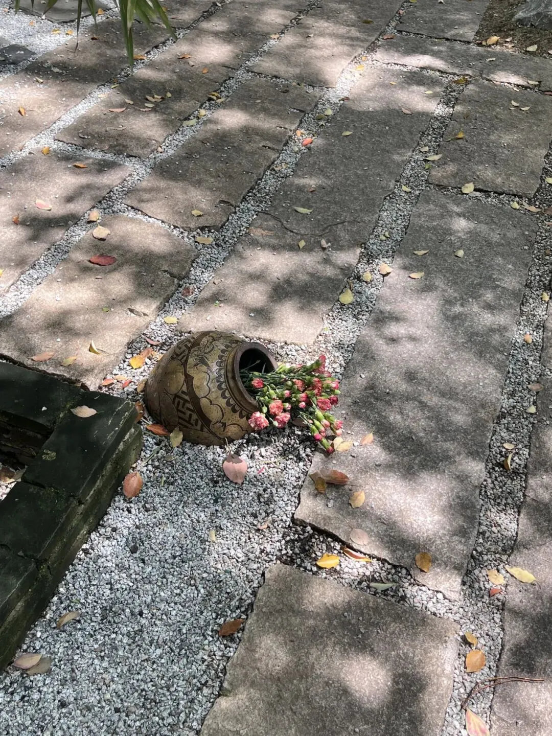 沐浴在阳光下、树影倒映在碎石路上