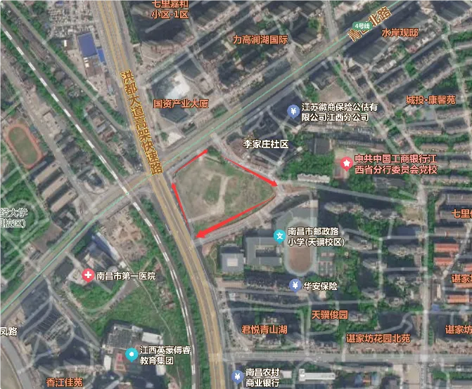 地块位于青山湖龙湖天街附近,交通便利,在2号线东延线城南大道北站与李巷站之间;距南昌市楞上小学1.4公里,距南昌二十八中教育集团青云学校700米;周边分布较多的大型住宅小区,商业繁华程度较高,配套设施齐全,与龙湖南昌青山湖天街相邻距万达广场约500米,距离天香园500米,该区域居住环境良好,配套齐全。