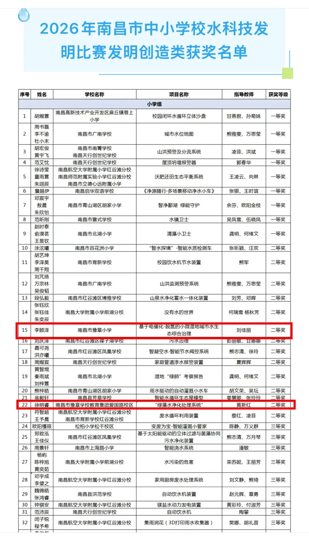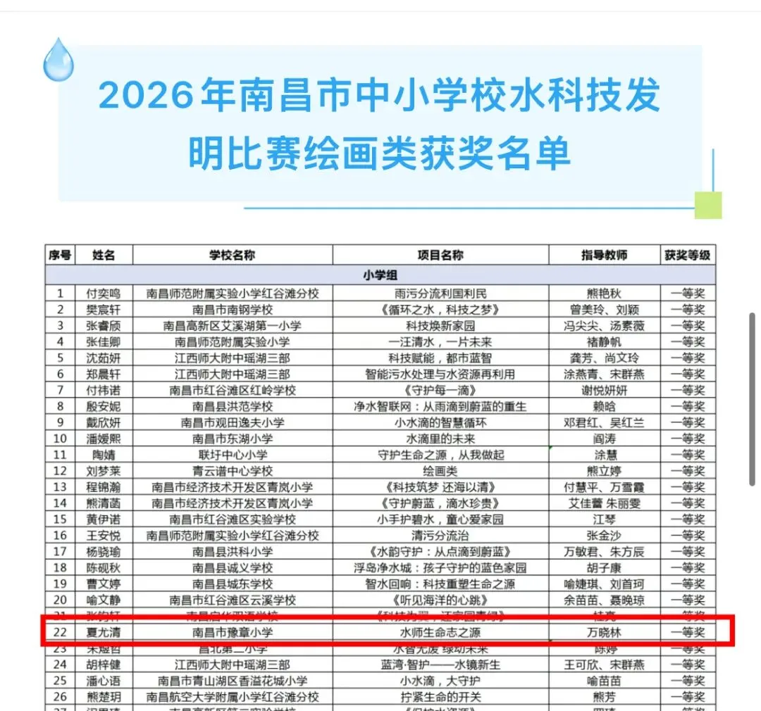 近日,2026年南昌市中小学水科技发明比赛获奖结果正式公示。学校学生积极参赛、表现亮眼,在绘画类与发明创造类赛事中荣获多项荣誉,展现了出色的环保意识与创新实践能力。