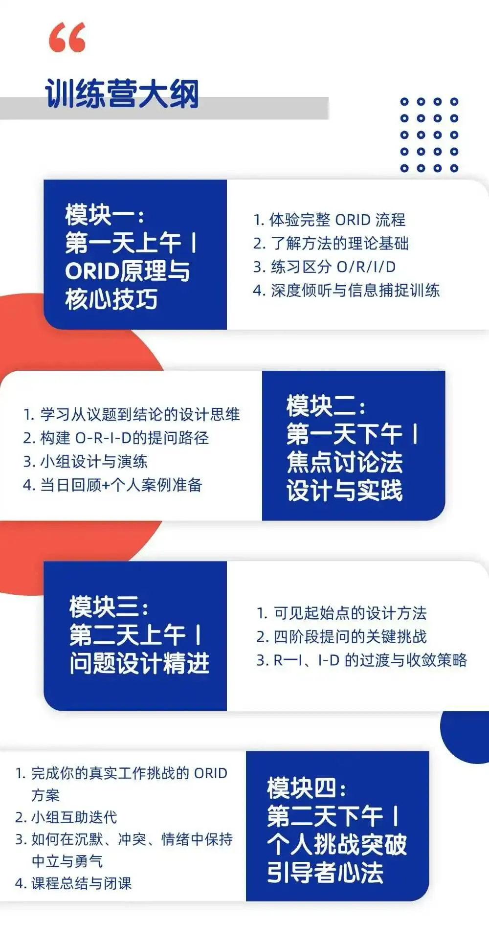 为了让这场ORID焦点对话方法论深化研修班更具实战意义,导师团队特别针对实际应用场景和学习痛点进行了课程升级。