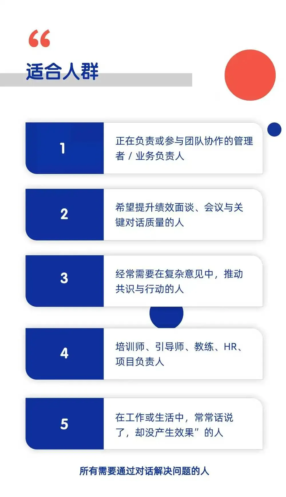定制化设计:带一个你最头疼的真实难题(如绩效访谈、项目复盘、家庭矛盾),现场在同伴和导师的帮助下,打磨出一套可以直接落地的对话方案 。