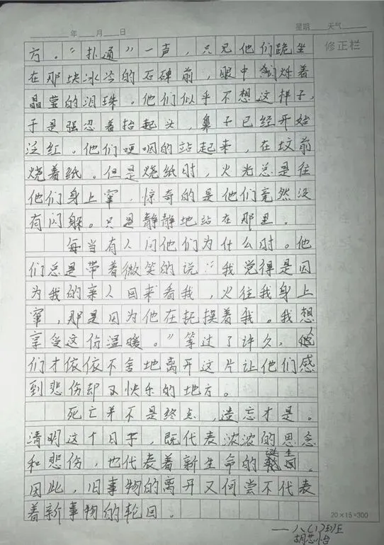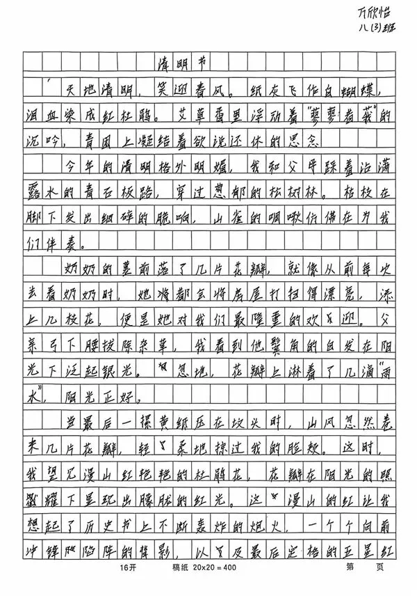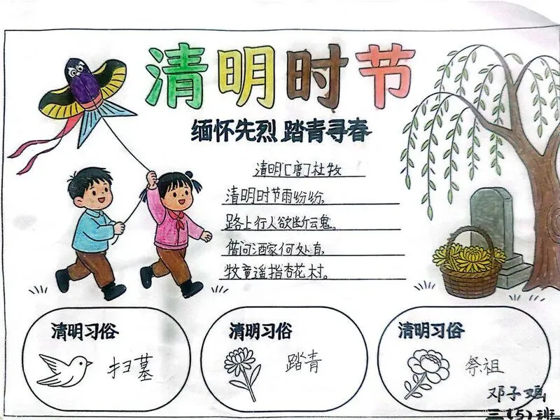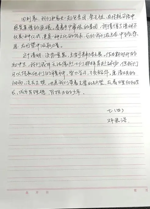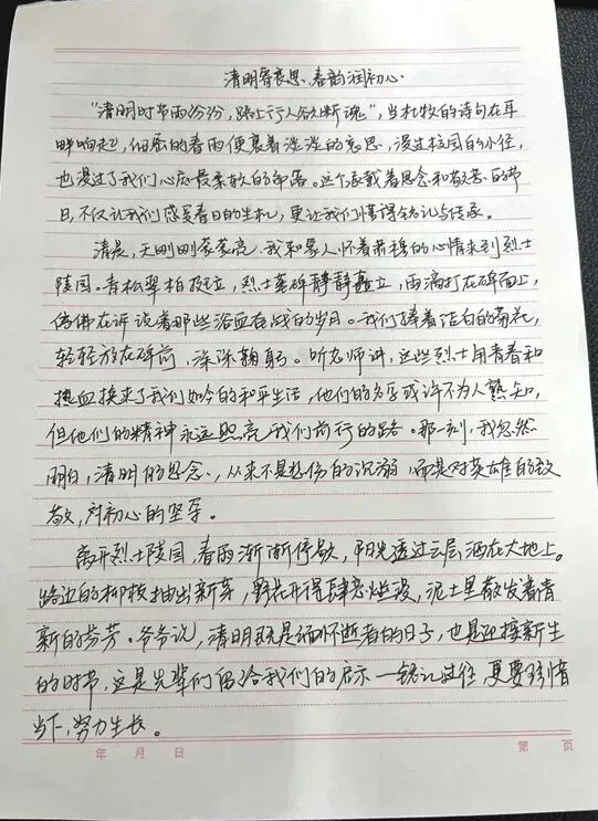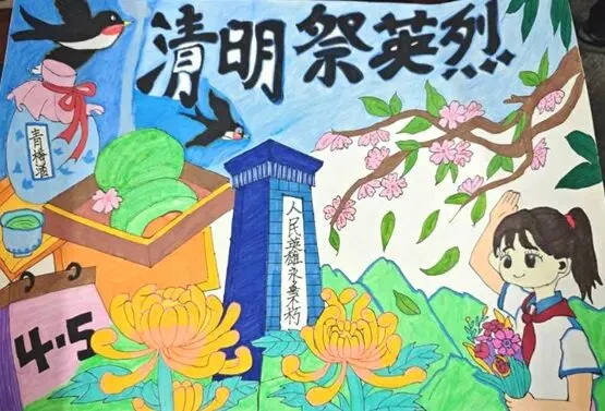以笔绘清明,以文颂英烈。一至三年级的小朋友们挥动画笔,以“清明祭英烈”为主题,绘出心中的英雄模样,色彩间满是童真的崇敬;四至六年级的同学们精心制作手抄报,一笔一划书写英烈故事,版式设计中融入红色元素,让红色记忆跃然纸上;七至九年级的学长学姐们以文寄情,撰写清明主题征文,用文字抒发对英烈的缅怀,畅谈新时代少年的责任与担当。一幅幅、一篇篇作品,都是学子们红色情怀的真挚表达。