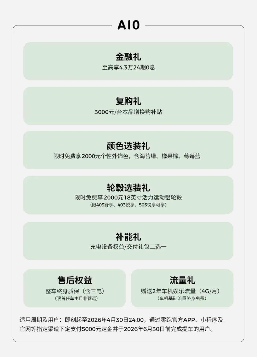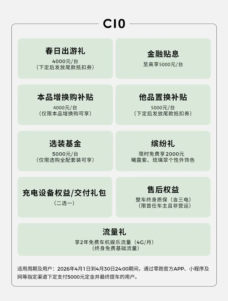 2026款C10下定可享至高45816元礼遇,包含春日出游礼4000元、金融补贴至高5000元、本品增换购礼包4000元、他品置换礼包5000元及全配套装基金5000元等。