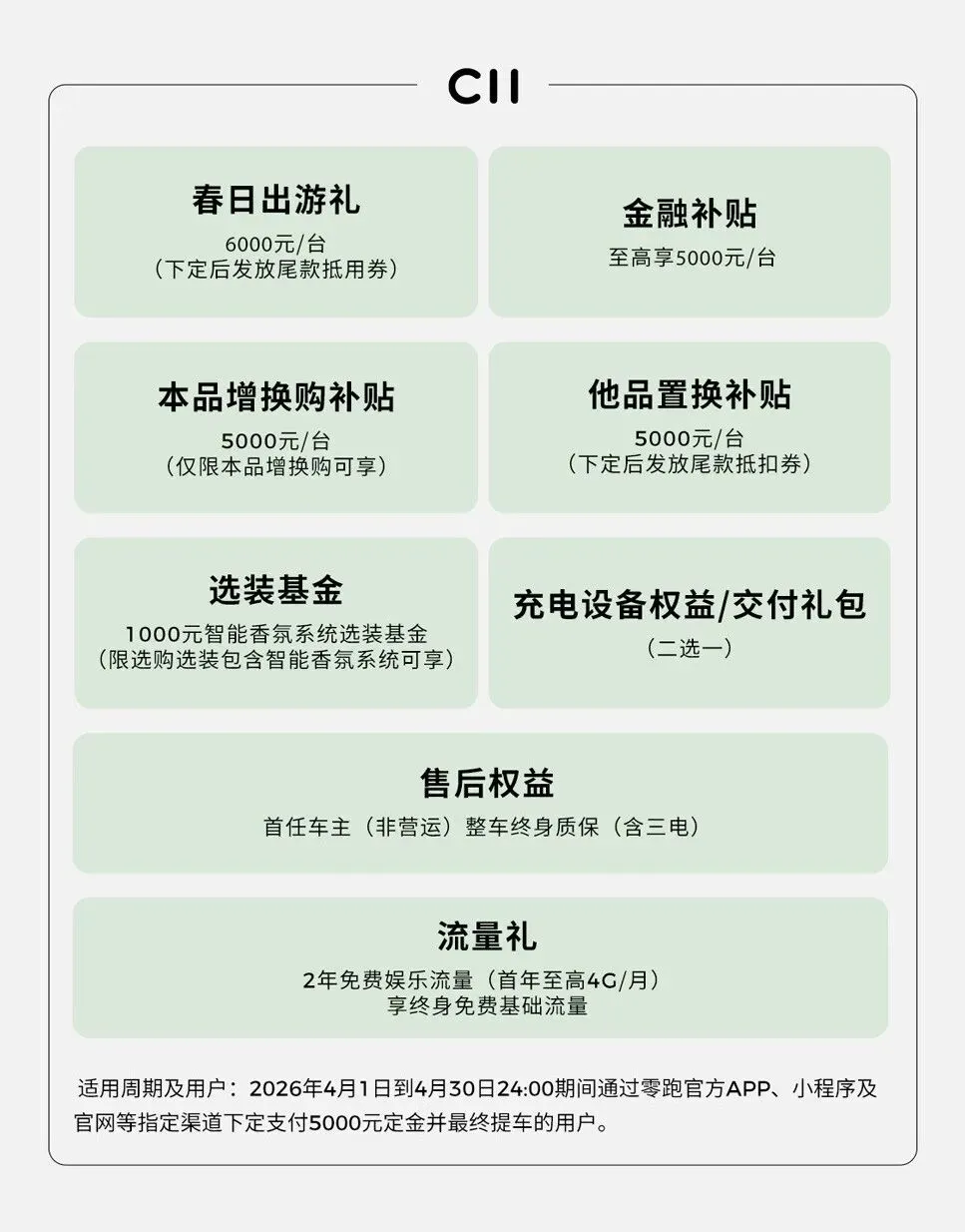 2026款C11则提供春日出游礼6000元、金融补贴至高5000元、本品复购及他品置换各5000元补贴,叠加1000元全配套装基金。