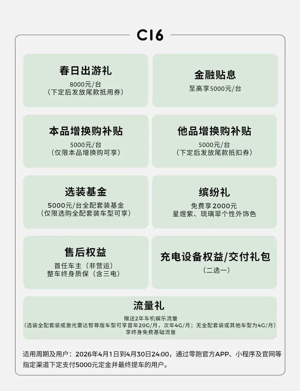 C16下定即享至高56680元礼遇,春日出游礼达8000元,叠加金融补贴至高5000元、本品复购礼5000元、他品置换礼5000元及5000元全配套装基金。