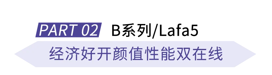 年轻朋友们看过来!Lafa5绝对是颜值担当,无边框车门,搭配19英寸掠翼运动轮毂,开出去回头率100%。颜值高,性能也不含糊,零跑 x Stellantis集团底盘团队联合调校,5.17m转弯半径,开在商圈回头率拉满;车身小巧,新手小白在老巷停车无压力~