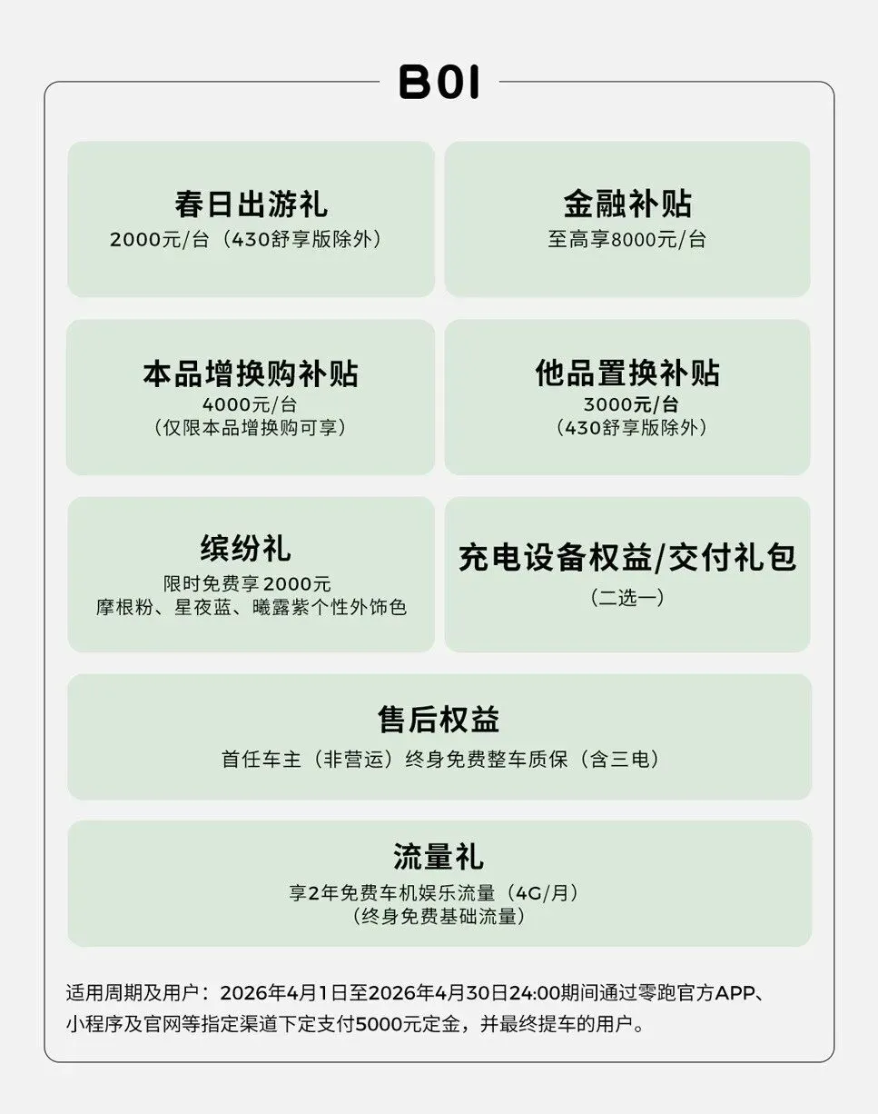 B01推出春日出游礼2000元、他品置换补贴3000元、本品增换购补贴4000元,金融方案可享5年免息及7年低息,贴息至高8000元。