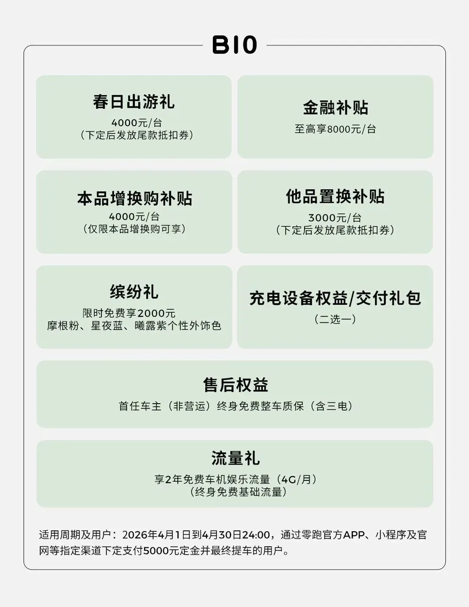 B10则提供春日出游礼4000元、本品增换购补贴4000元、他品置换补贴3000元、金融补贴至高8000元,并限时免费赠送2000元个性外饰色。