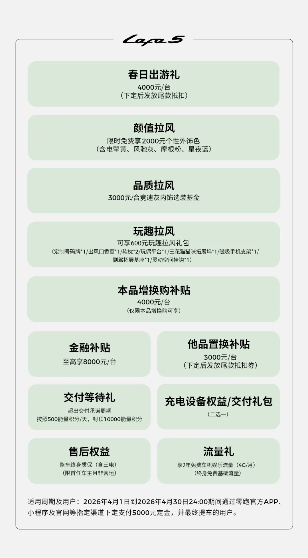 Lafa5车型同样推出多项权益:春日出游礼4000元、他品置换礼3000元、本品增换购补贴4000元、金融补贴至高8000元。同时,限时免费享2000元个性外饰色,锁单用户还可获竞速灰内饰选装基金3000元及600元玩趣礼包;提现车享钜惠至高44016元综合权益,满足年轻用户对个性化与品价比的双重需求。