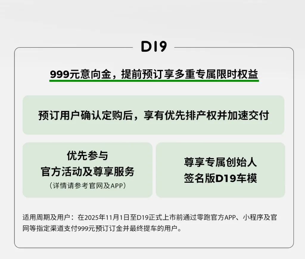 目前提前预订权益仍在进行中,用户支付999元意向金,确认定购后可享优先排产权、加速交付、优先参与官方活动及尊享服务,并可获得专属创始人签名版D19车模(限量2000名)。