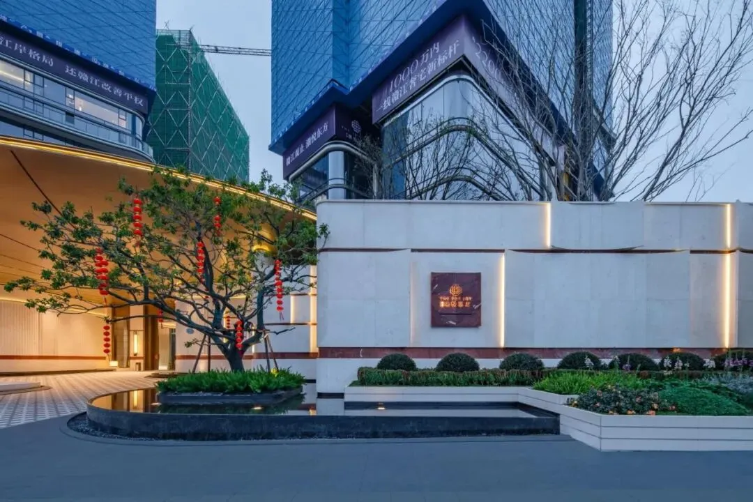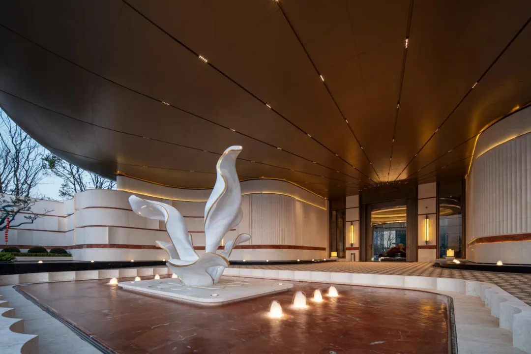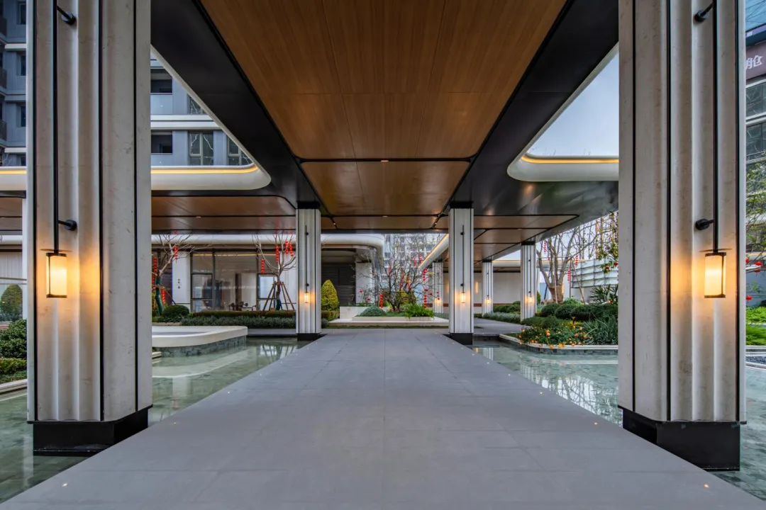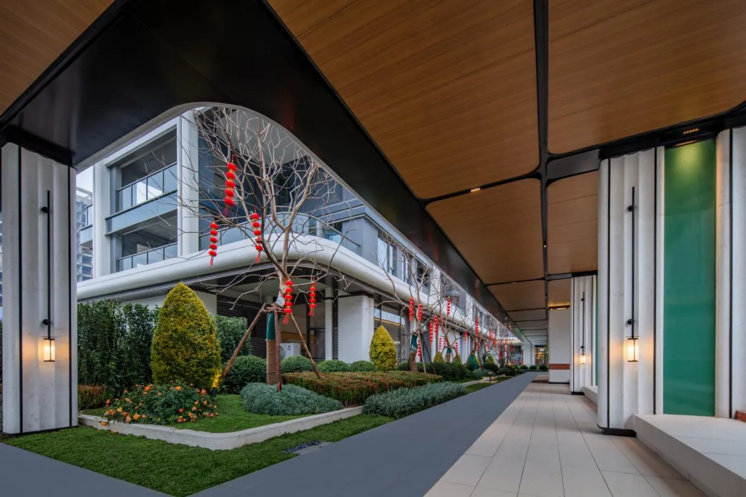 中央环岛设计,搭配高约6M的对植红果冬青,取意“红果迎门,吉祥入户”。近40米椭圆形“悬浮顶”设计,气场大开;金边瑞香艺术水景与赣江波澜遥相呼应,动静之间,形成层层递进的空间韵律,让每一次归家,都是一场由尺度的把控、材质的碰撞与乔木的搭配共同烘托的仪式。