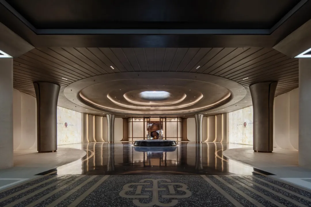 同时,项目还打造了南昌江边首个中央车站地下车库,这也是许多一线城市高端产品的手法,大量的石材,全空间吊顶,上方还有一抹天窗,流动着园林的水景。