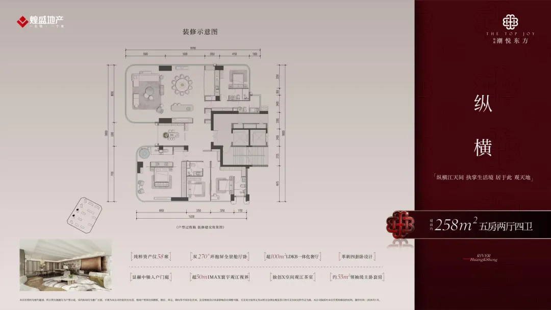 从户型设计上,煌盛这次也是疯狂炫技。有三种产品,一线临江双U全景舱大平层、第四代住宅和越级新规户型。一线临江的双U全景舱,一共两种户型,建面约258㎡五房大平层和建面约200㎡四房三卫大平层。