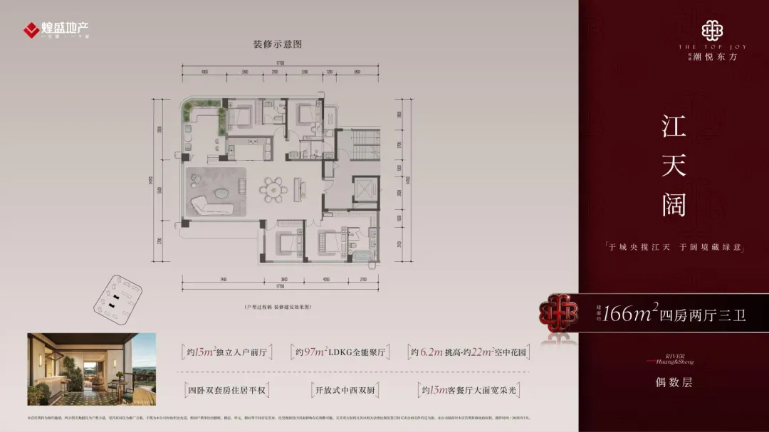建面约166㎡四房三卫户型,空间使用率达到约124%。DKG一体化设计,面积能达到约97㎡,约13米餐客厅大面宽采光,套内户型方正,动线合理。