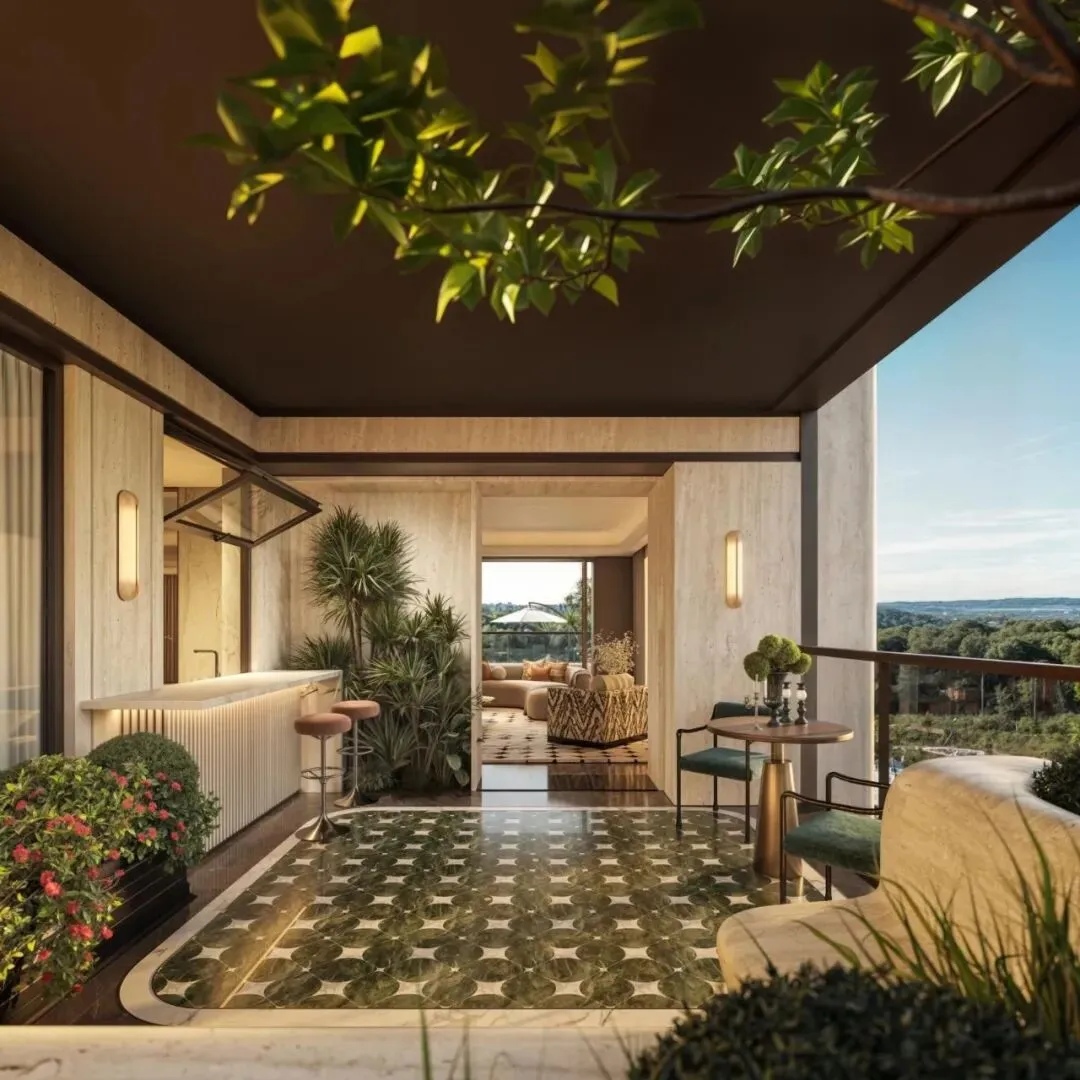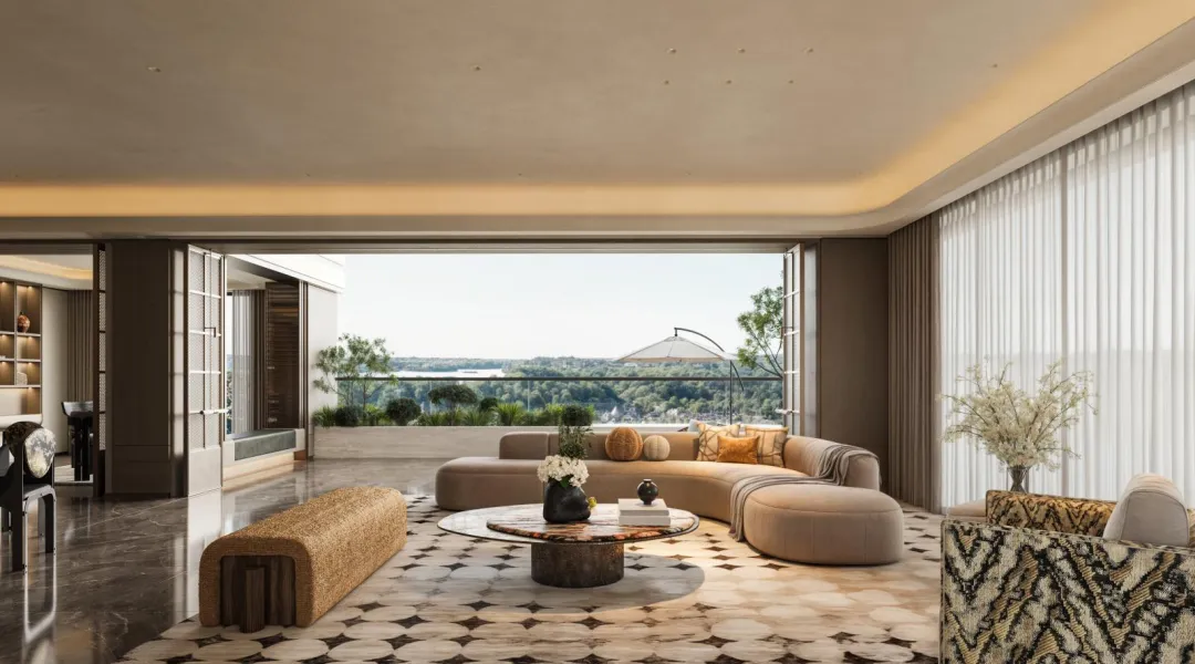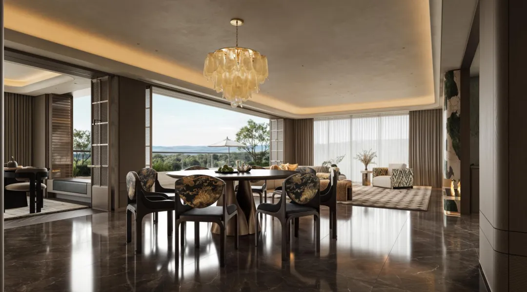 “国际美学+赣江文化”的融合表达,是煌盛·潮悦东方的核芯价值。项目引入希腊基亚岛唯逸酒店(One&Only)顶奢度假酒店的设计理念,又在地化转译东方文化基因。在这里,我们可以看到: