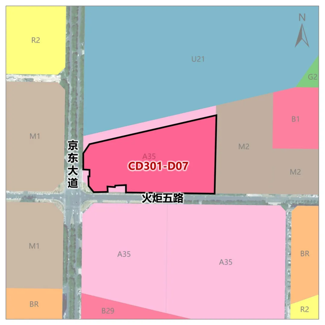 位于高新区火炬五路以北、京东大道以东;面积为84亩;土地用途商业用地。容积率≤1.0-1.5,建筑密度≤40%,绿地率≥10%。