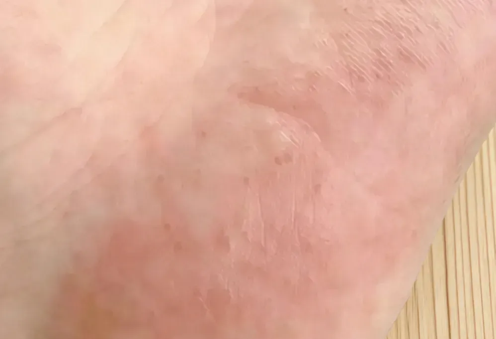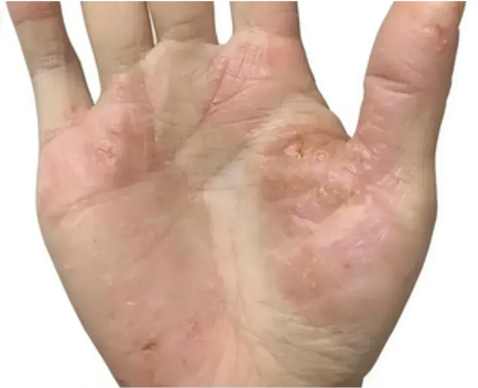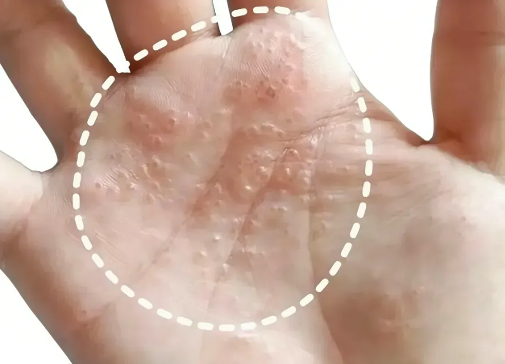 核心症状:水疱常对称出现在手指侧、手掌及脚底,内含清澈液体,一般不易自破,瘙痒较明显。待水疱干涸后会伴随脱皮现象,且易反复出现。