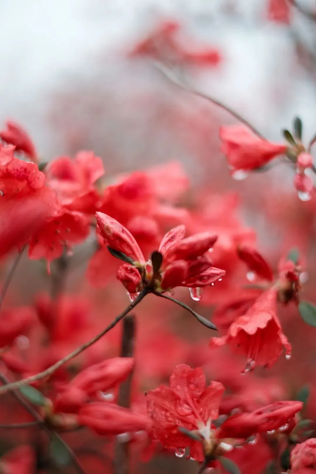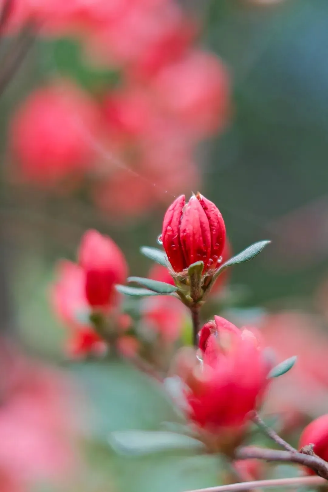 抬头望远山,雾在山腰移动。朦朦胧胧中,杜鹃花时隐时现,它在这样时刻,具有独特美感。再加上,昨夜春雨刚落,杜鹃芽孢上的露珠晶莹剔透,更加娇艳欲滴。