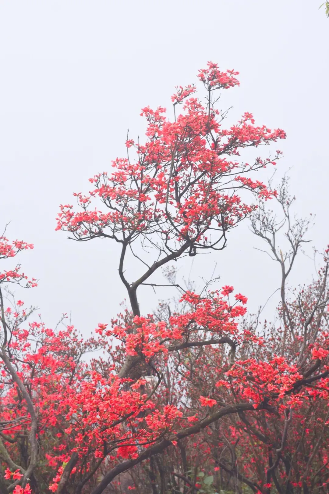 等到爬到山顶,雾还没有散去,但颇有花海之感。杜鹃树的形态也更加多样和别致,凝望近处,一树嫣红,独倚清寒,将赤焰燃于云端,春天就这样被凸显。