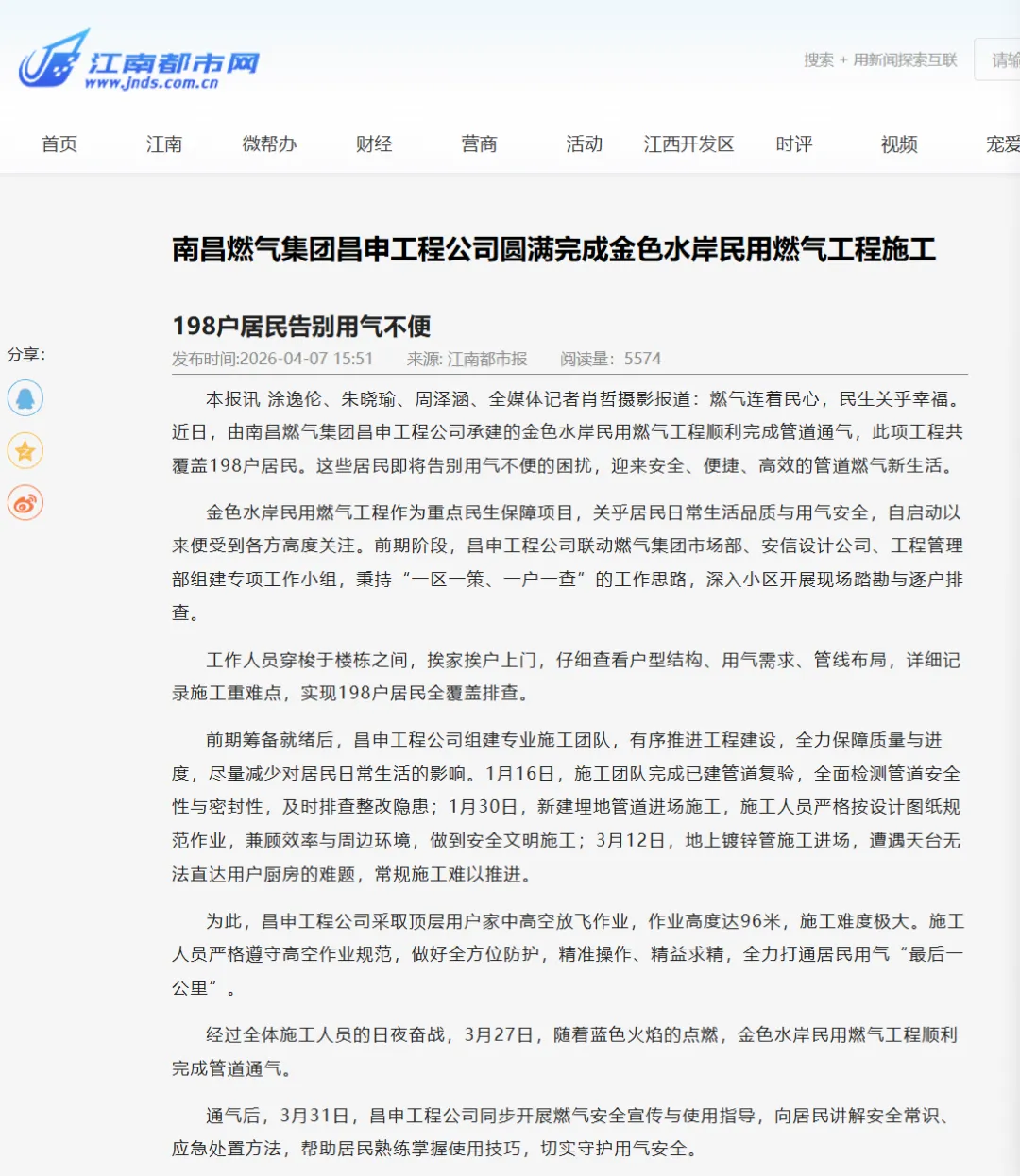 本报讯 涂逸伦、朱晓瑜、周泽涵、全媒体记者肖哲摄影报道:燃气连着民心,民生关乎幸福。近日,由南昌燃气集团昌申工程公司承建的金色水岸民用燃气工程顺利完成管道通气,此项工程共覆盖198户居民。这些居民即将告别用气不便的困扰,迎来安全、便捷、高效的管道燃气新生活。