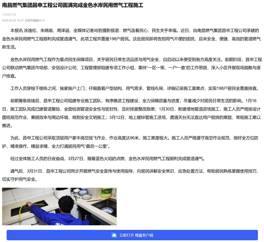 燃气连着民心,民生关乎幸福。近日,由南昌燃气集团昌申工程公司承建的金色水岸民用燃气工程顺利完成管道通气,此项工程共覆盖198户居民。这些居民即将告别用气不便的困扰,迎来安全、便捷、高效的管道燃气新生活。南昌燃气集团昌申工程公司圆满完成金色水岸民用燃气工程施工