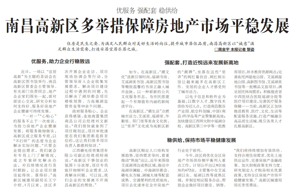 2月14日,《南昌日报》刊登了题为《优服务 强配套 稳供给——南昌高新区多举措保障房地产市场平稳发展》的报道。