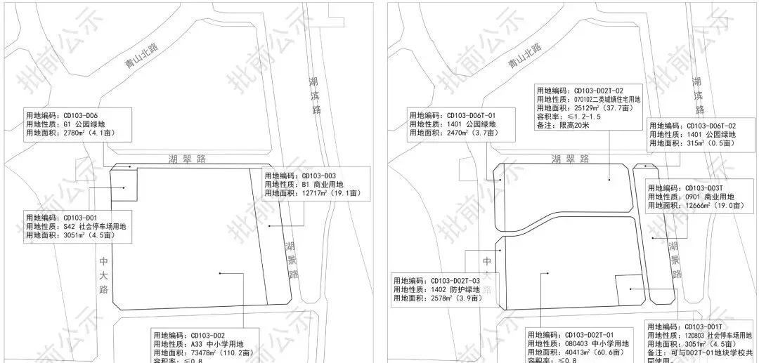 主要将CD103-D02中小学用地分拆为多宗土地,其中CD103-D02T-02地块为住宅用地,用地面积37.7亩,容积率1.2-1.5,CD103-D02T-01地块为学校用地,用地面积60.6亩,容积率0.8,CD103-D01T地块为社会停车场用地,用地面积4.5亩,可与学校用地共同使用。