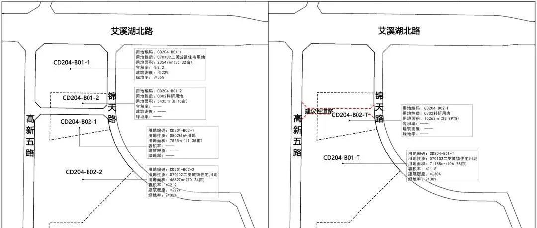 从调整方案看,主要将CD204-B01-1、-2地块合并为科研用地,地块用地面积22.89亩;将CD204-B02-2地块调整为住宅用地,用地面积106.78亩,容积率1.8,建筑密度30%,绿地率30%。