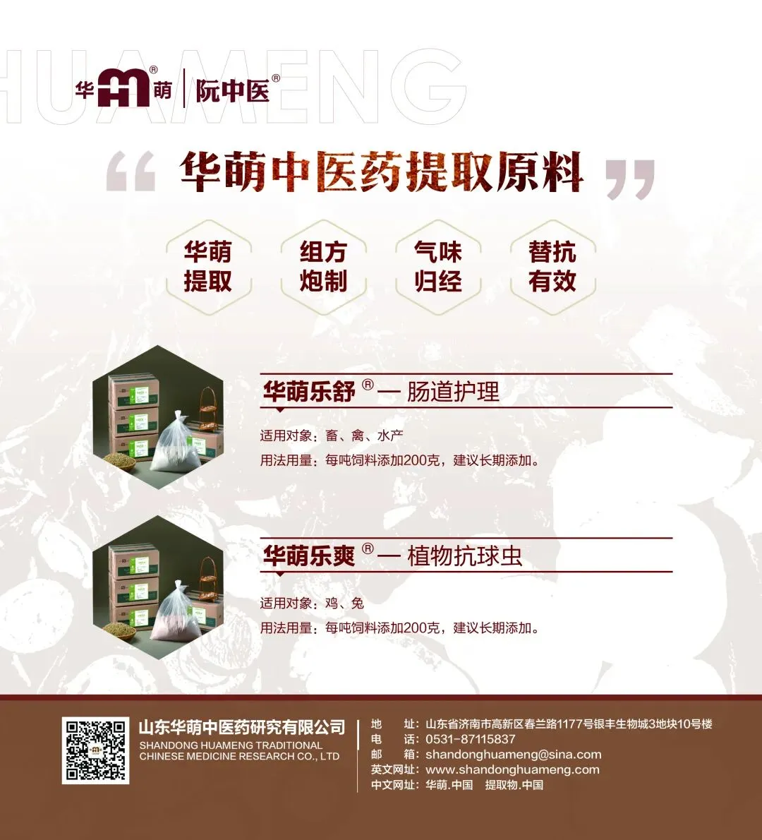 公司始终秉持绿色、生态、健康的发展理念,坚持传承中华国药精髓,遵循中兽医“遵古炮制 君臣佐使 理法方药”的实践理论,主张传统医药的现代应用,经过阮明华董事长四十余年对中兽医理论的潜心研究,对《饲料原料目录》第7.6条文件中117种药食同源天然植物饲料原料进行深入学习和实践应用,再结合自身多年的中兽医临床经验,自主研发的天然植物提取物完美地替代了抗生素,其中华萌乐舒®-肠道、华萌乐爽®-球虫、华萌舒宁®-抗应激、华萌肉多多®、华萌蛋多多®、华萌奶多多®等多个爆款产品,在国内行业市场中拥有良好的口碑和影响力。研发的天然植物提取物有100多种,涉及畜禽、水产、牛、羊、宠物、特种动物等,为畜牧饲料领域提供了全面、绿色、健康、替抗、有效的产品。