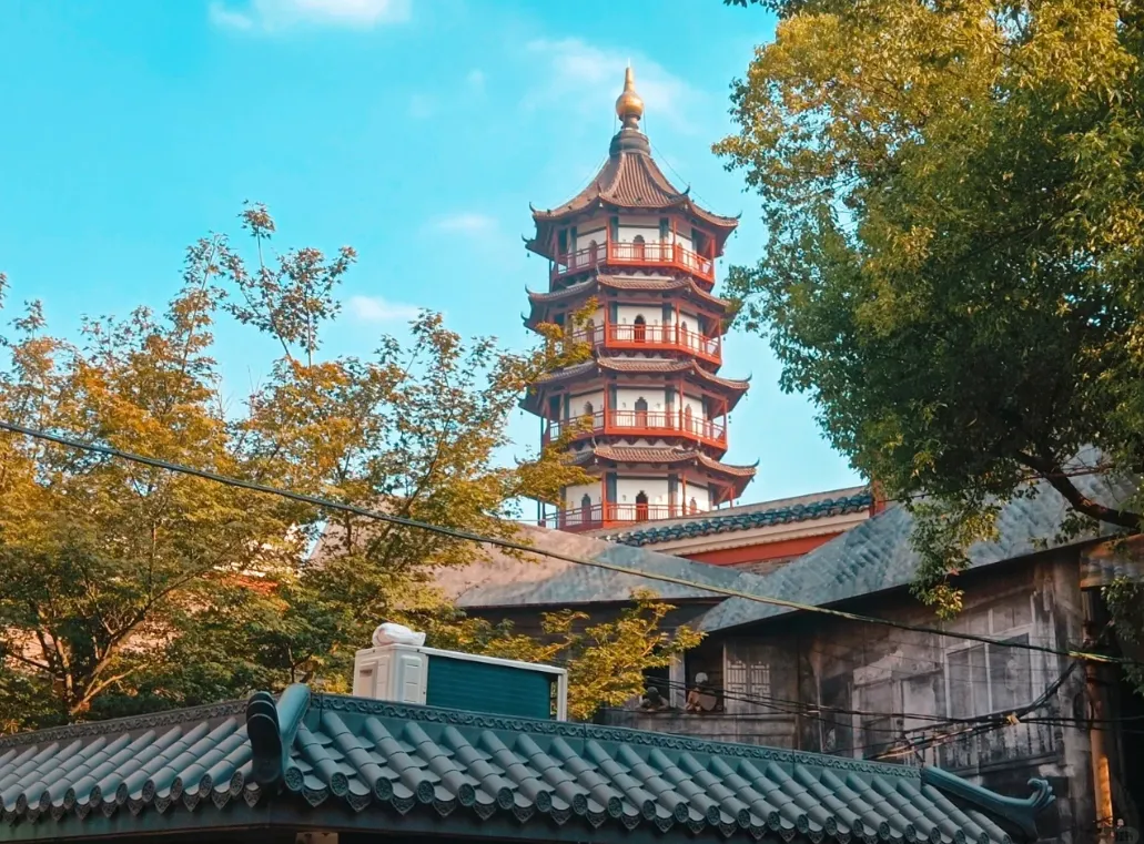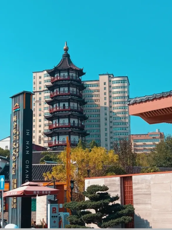 扫街第一站,必去绳金塔。这座始建于唐代的千年古塔,是南昌的镇城之宝,朱栏青瓦、飞檐挂铃,微风拂过,铜铃声声,诉说着千年岁月沧桑。塔下青石板路蜿蜒,唐风商铺错落,非遗集市藏着剪纸、赣绣等老手艺,偶尔能遇见老匠人现场创作,时光仿佛在此慢下来,每一处砖瓦都藏着南昌的人文印记,登塔远眺,老城全景与现代高楼同框,古今碰撞的氛围感拉满。