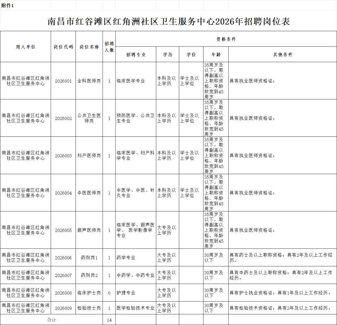 具体招聘岗位及招聘人数详见《南昌市红谷滩区红角洲社区卫生服务中心2026年招聘岗位表》(附件1)。