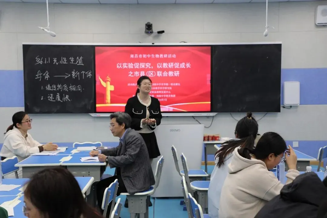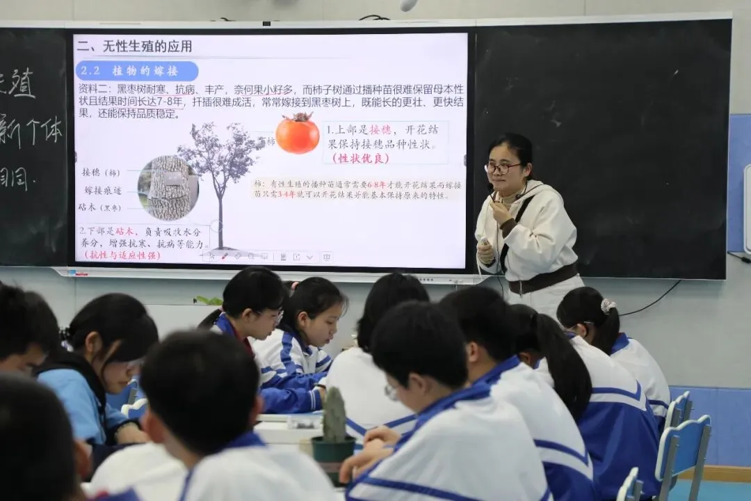 随后,南昌市红谷滩区豫章初级中学熊兰兰老师带来八年级下册《无性生殖》一课。本节课从学生桌上的绿萝礼物自然引出“无性生殖”课题,激发兴趣。教师先展示多种动植物、微生物的无性生殖实例,引导学生归纳无性生殖的概念、特点和意义。接着自然过渡到应用:从发酵工程中菌种纯度的保持,到生活中常见的扦插技术——结合绿萝礼物学习扦插操作要点;再通过柿子树嫁接黑枣树的实例,引导学生分析接穗与砧木如何选择及嫁接成活关键,并让学生动手操练仙人掌嫁接蟹爪兰,在“做中学”理解嫁接技术。随后以草莓脱毒难题引出组织培养及其优点。最后布置课后作业:继续寻找无性生殖的其他实例,并持续观察自己的嫁接植物,将学习延伸至生活。
