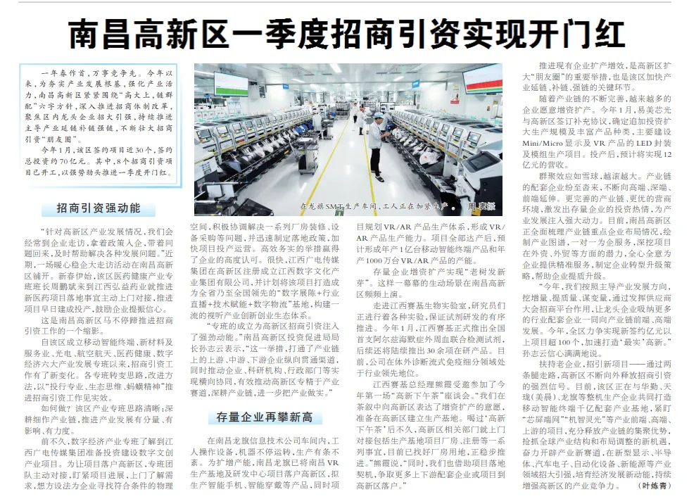 “专班的成立为高新区招商引资注入了强劲动能。”南昌高新区投资促进局局长孙志云表示,“这一举措,打通了产业链上的上游、中游、下游企业纵向贯通渠道,同时推动企业、科研机构、行政部门等实现横向协同,有效推动高新区专精于产业赛道,深耕产业链,进一步把产业做实。”