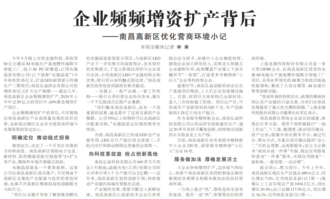 8月14日,《江西日报》报道:企业频频增资扩产背后——南昌高新区优化营商环境小记。