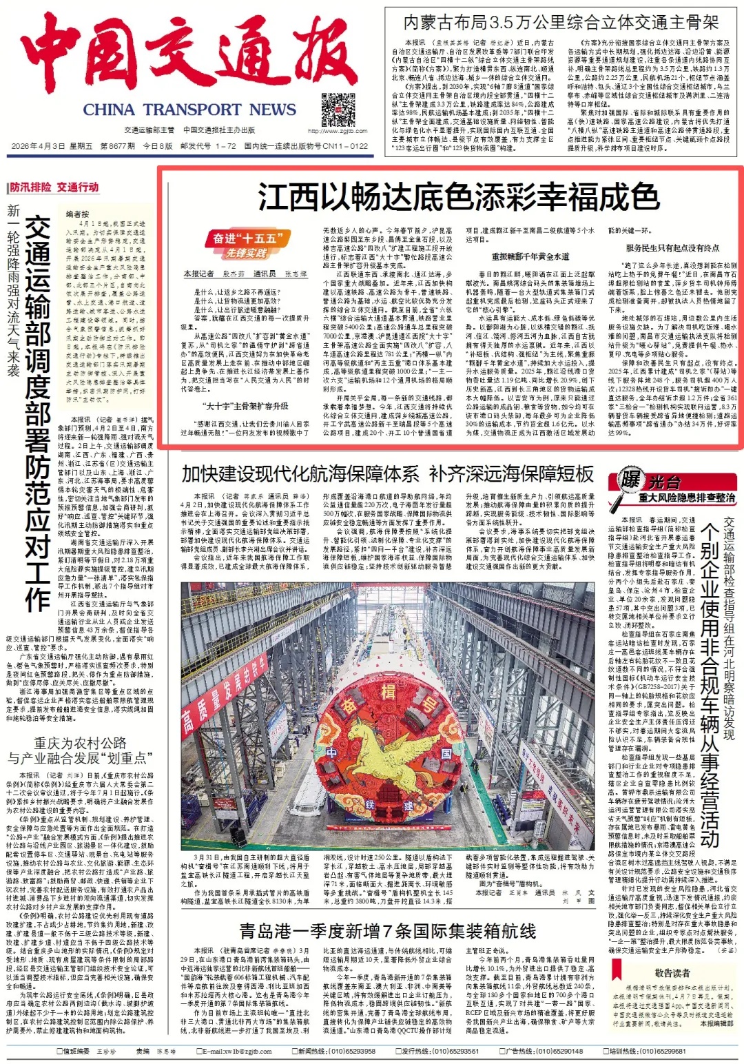 从高速公路“四改八”扩容到“黄金水道”复苏,从“司机之家”的温情守护到“跨省通办”的高效便民,江西交通努力在加快革命老区高质量发展上走在前、在推动中部地区崛起上勇争先、在推进长江经济带发展上善作为,把交通担当写在“人民交通为人民”的时代答卷上。